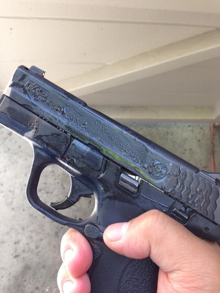 Sweat all over the left side of the gun. Carrying at 5'o clock IWB in a crossbreed holster. Wasn't hot at all today but I was out in the sun working.
