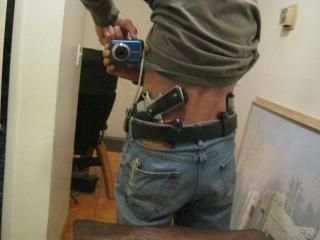 Pic wearing the 1911 and mag holder. (I'm a righty... the mirror flipped the image) The butt of the gun sits tight against the hollow in my lower back with a good belt (I use hanks amish belt) Just noticed in the pic I missed the middle belt loop with the belt... I took everything off for the pics of the holsters, and threw it back on real quick for a pic wearing it.....