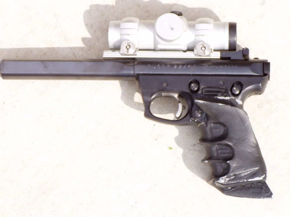 However, regarding "custom" grips..... Here is a pic of my 22/45 with a piece of tin from a pie plate epoxied on the lower right side, then a liberal amount of "Bondo" applied while wearing a rubber glove....