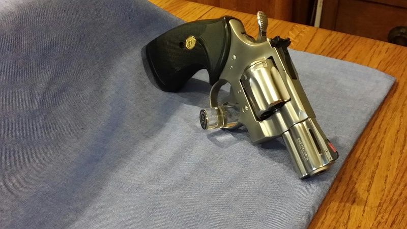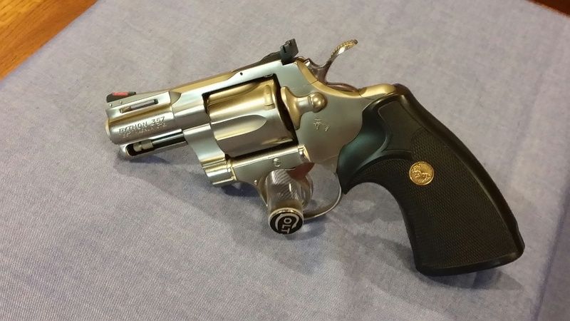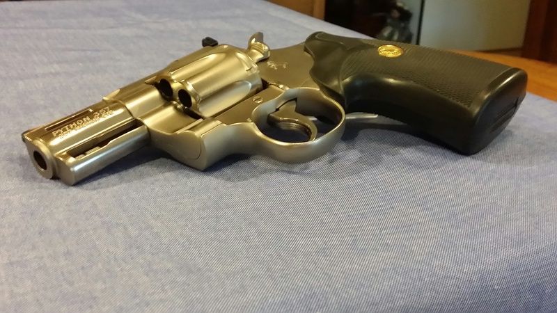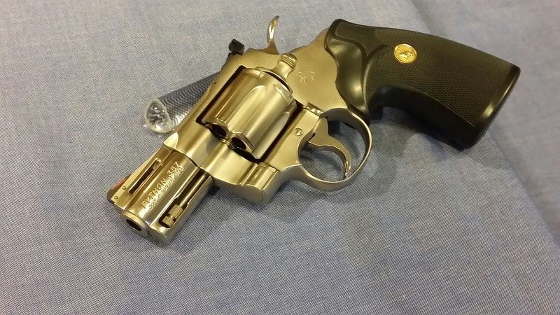 I recently found this rare 2.5" electroless nickel Colt Python in a gun shop 50 miles from my home. I wasn't looking for it but it ended up finding me instead as I was walking out of this new store that hadn't been opened very long and I happened to spot this Python in an unlighted gun display case......wow this was quite an unexpected surprise for me! So I jumped on this immediately! The price was right too...so I couldn't pass this deal up! Following are some pictures: