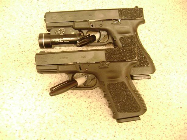 Here is my new G20SF. I installed a set of 10-8 sights, Ghost 3.5lb. trigger and a KKM barrel for easy reloading. I shot 100 factory on Friday and reloaded 100 rounds that were tested today. The load consisted of 8.4g. of longshot under a Montana Gold 180g. HP. The Ghost trigger kit made a huge difference. I would guess the trigger in stock form was around 11lbs. After the trigger work it is closer to 5lbs. The pict shows one of my best groups at 15 yards, freehand with handloads. It has been 100% reliable so far. Needless to say I am very pleased.