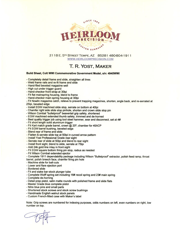So the hunt began to find a Colt World War I reproduction, which was no easy task as the gun had been out of production for quite some time. After a few months of searching I finally got one (had to go through the whole SSE process). It was in my hands for exactly one day before being shipped off to Heirloom to secure a place on the waiting list.