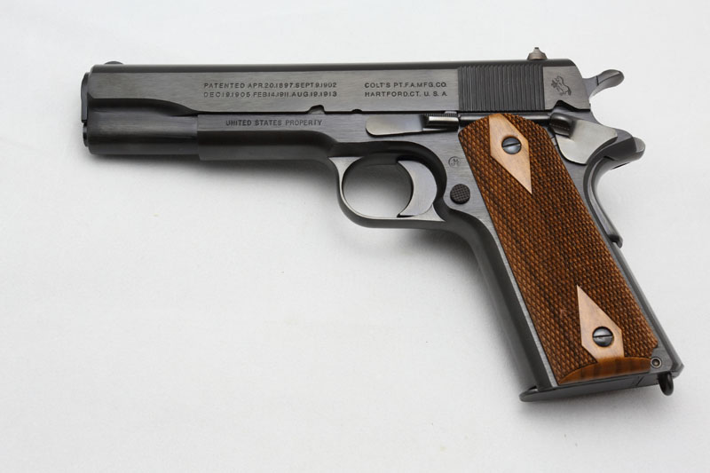 This gun was modeled after a 1918 Colt World War I pistol. Pictured here with the gun that inspired it, an all original Colt. Notice the same roll marks and stylized "JMG" acceptance stamp (John M Gibert).