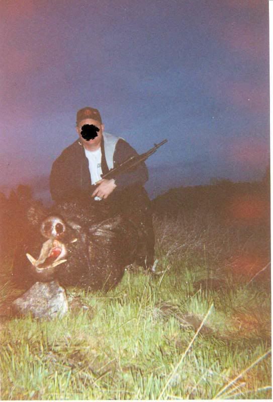 Well, he was about 60 yards away, on the side of a hill, with a dirt road at the bottom. This was a guided hunt in Mendocino County (2004). It happended pretty fast. My first shot went into his right shoulder (unfortunately). He headed for the brush on top of the hill, the guide yelled "hit him again". I fired. He told me to hit him again, and I fired again. This time he started to roll down the hill (toward the road). When I got to him, his right front foot was blown apart and his right back foot was blown apart. You could not see any wound any where else. I thought I might have missed one of the shots, but I knew those two foot shots would not have killed him. The entry wound was not visible at all. There was no exit wound. The bullet I used was Remington Core-Lokt, 150 grain.