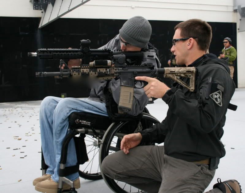 Check out Travis' blaster in this pic from a magpul class. What could that blur under his handguards be? Possible magpul handstop?? Also, note the camo CTR....