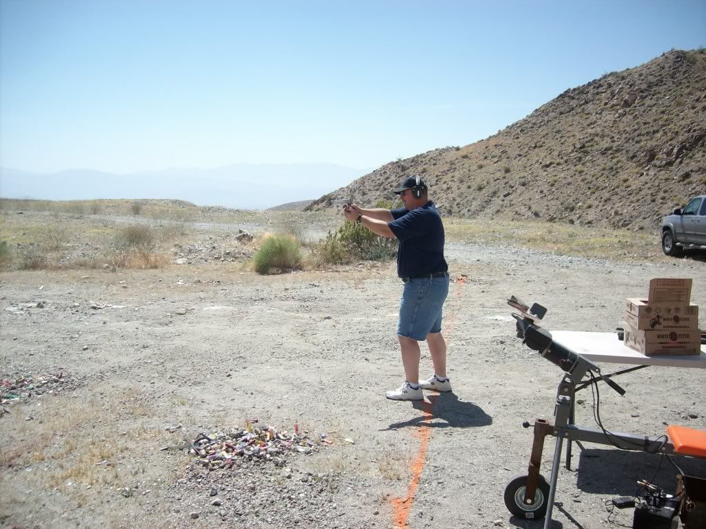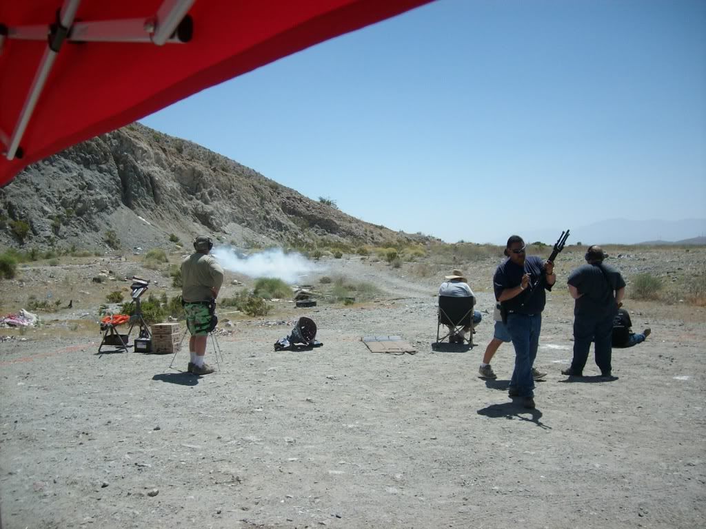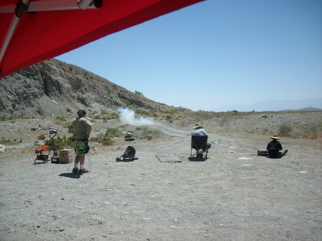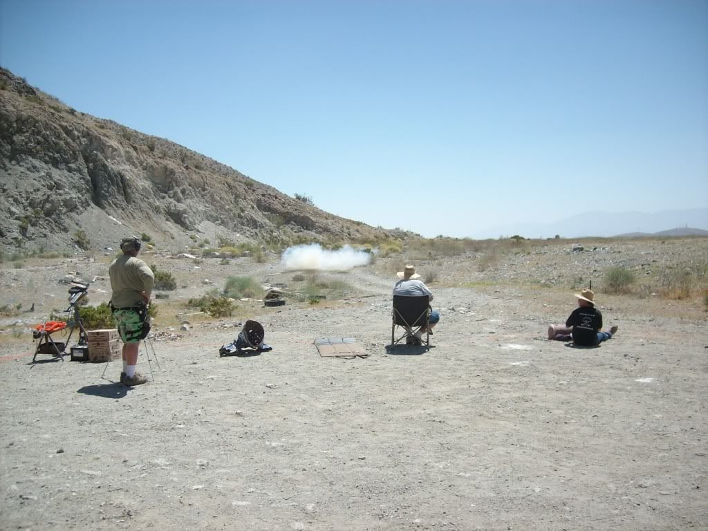 Another great day of shooting with some friends. The weather was getting hot with just a slight breeze. All my guns worked perfectly. Shooting the SureShotExplodingTarget is always a highlight of the day. It's a BLAST! Thanks Ed! It always nice to see familiar faces and good to meet new people. It's looking like next month will be a sunrise service if we keep doing this once a month. It's starting to get hot here in the desert. The puffs of smoke you see are the SureShotExplodingTargets.