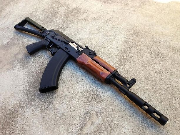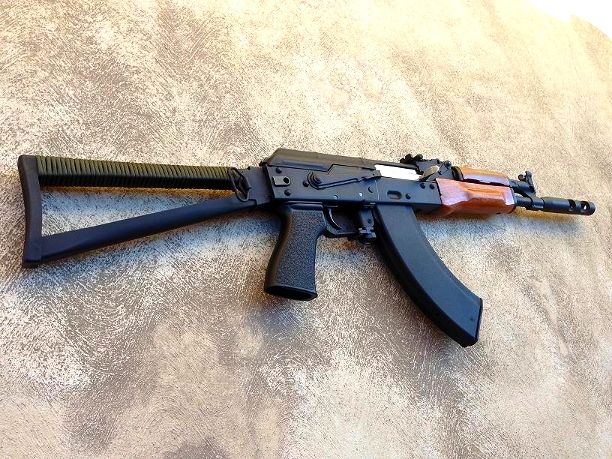 In California we have to keep long guns at 30" minimum, which explains the long muzzle brake from Atlantic Arms where I also got the U.S. barrel. I still wanted to be able to fold down the butt stock.