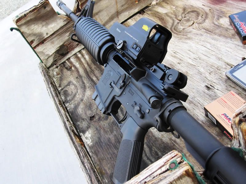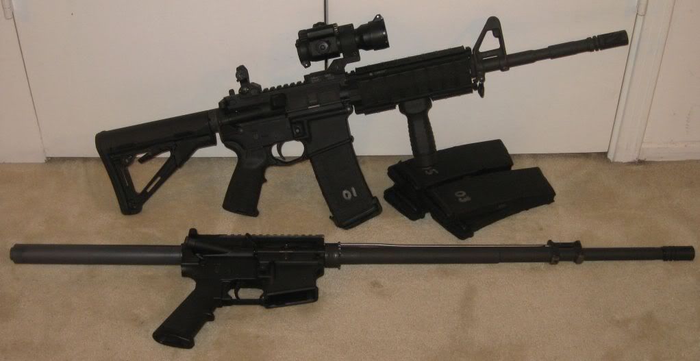 My carbine and what used to be my M16A4 clone. Right now its undergoing construction to become a "precision" rifle. Just waitng to pick up a Magpul PRS, Troy MRF RX, LaRue LT-104, MIAD, and some 10/20 pmags. Im not sure if I want to go FDE, foliage, or just stick with black.