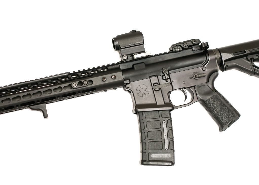 -Spikes lightweight 14.5" mid length barrel, had a FSB and brake pinned on to make overall length 16.1"