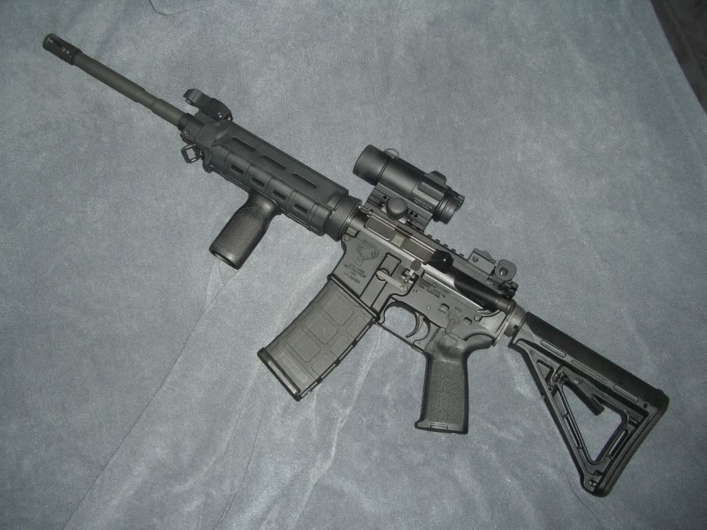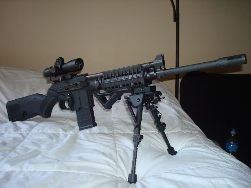 Stag lower, DPMS Hi-Rider Upper/LPK/FFT, Model 1 Sale 24" bull barrel, Choate E-2 Buttstock, DPMS TiN Coated Bolt Carrier Assembly , PRI Gas Buster charging handle w/ military big latch.Comment