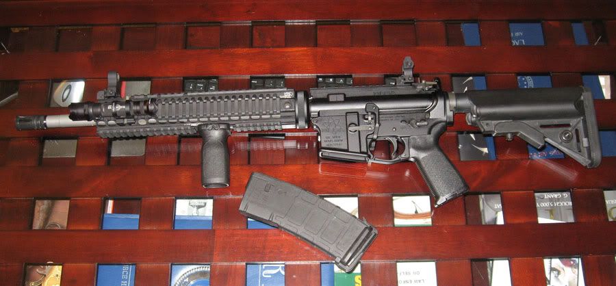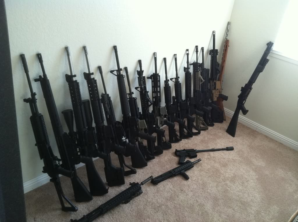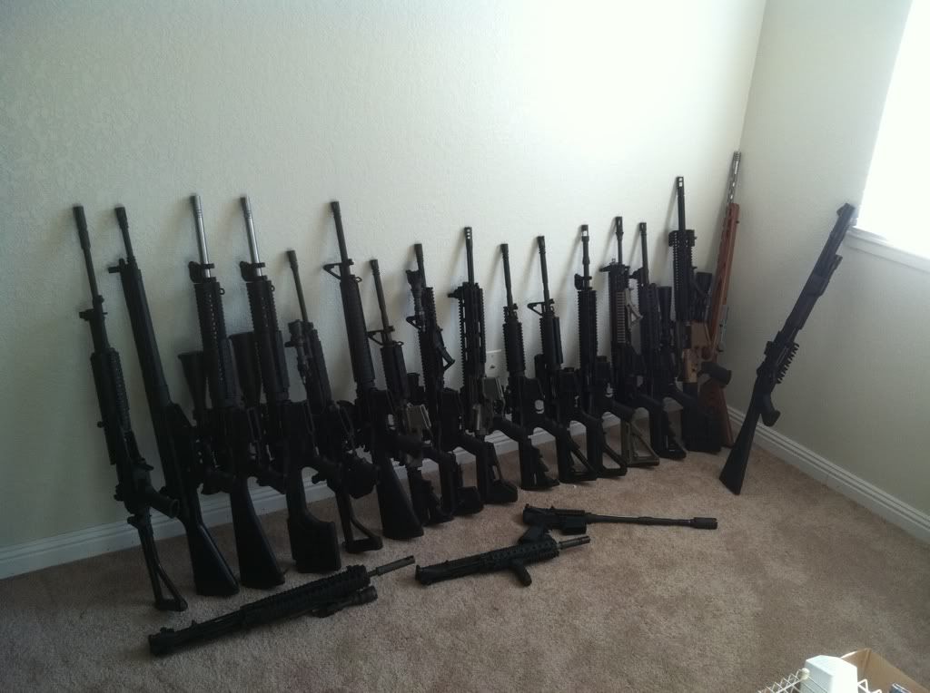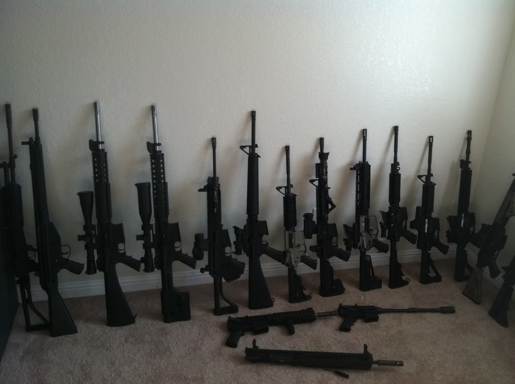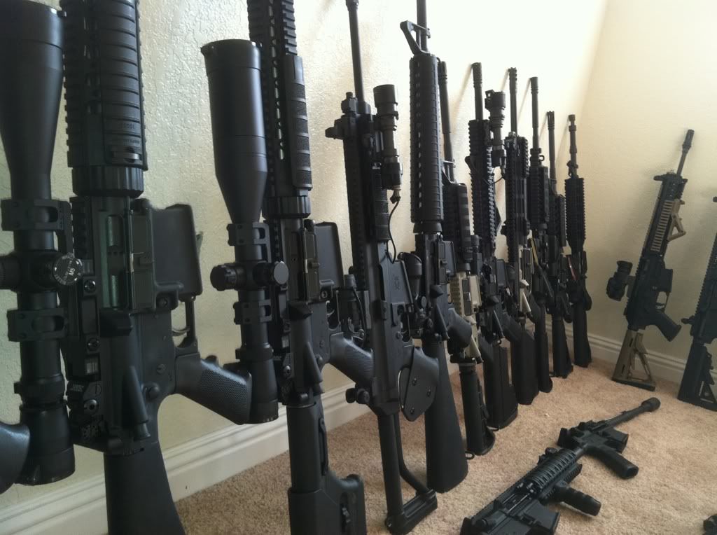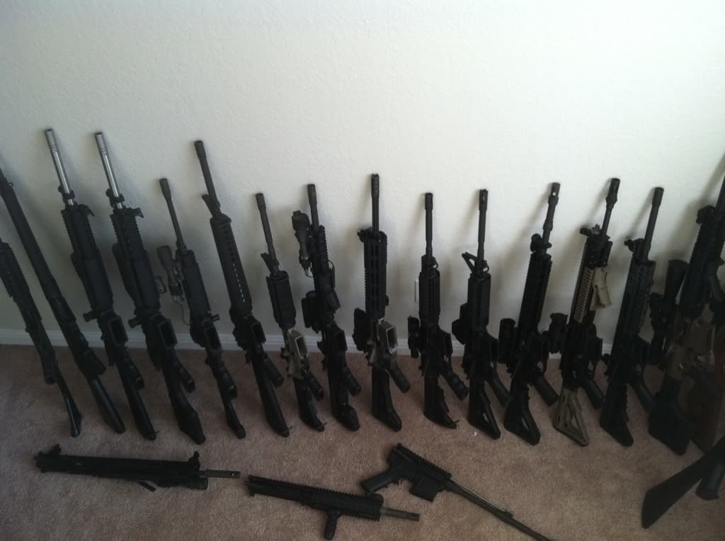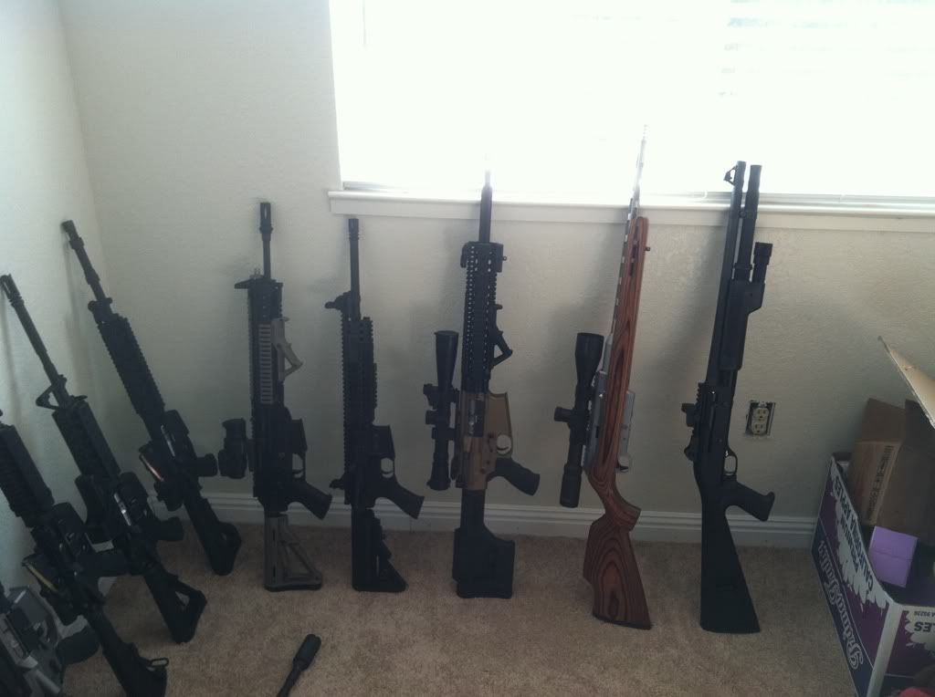 CAI Golani Galil, CAI Cetme, Armalite AR-10 SASS/Leu MKIV M5, Armalite AR-10 SASS/Leu MKIV Illum, Robinson XCR/Comp M3, RRA 20" A4 Acog TA01NSW, Hodge Podge of AR parts painted FDE, Daniel Defense Version 1/Comp M4, POF 16" mid length/Acog TA31F, RRA 16" A4/Acog TA24-2, LMT Defender/Eotech 552, Armalite SPR Mod 1/Acog TA31F, Sig Sauer 556/Comp M2, Barrett Rec7 6.8, Si Defense bilet AR308/Leu MKIV M3, Volquartsen Evolution/Burris XTR, Benelli M1/ Burris Fastfire.