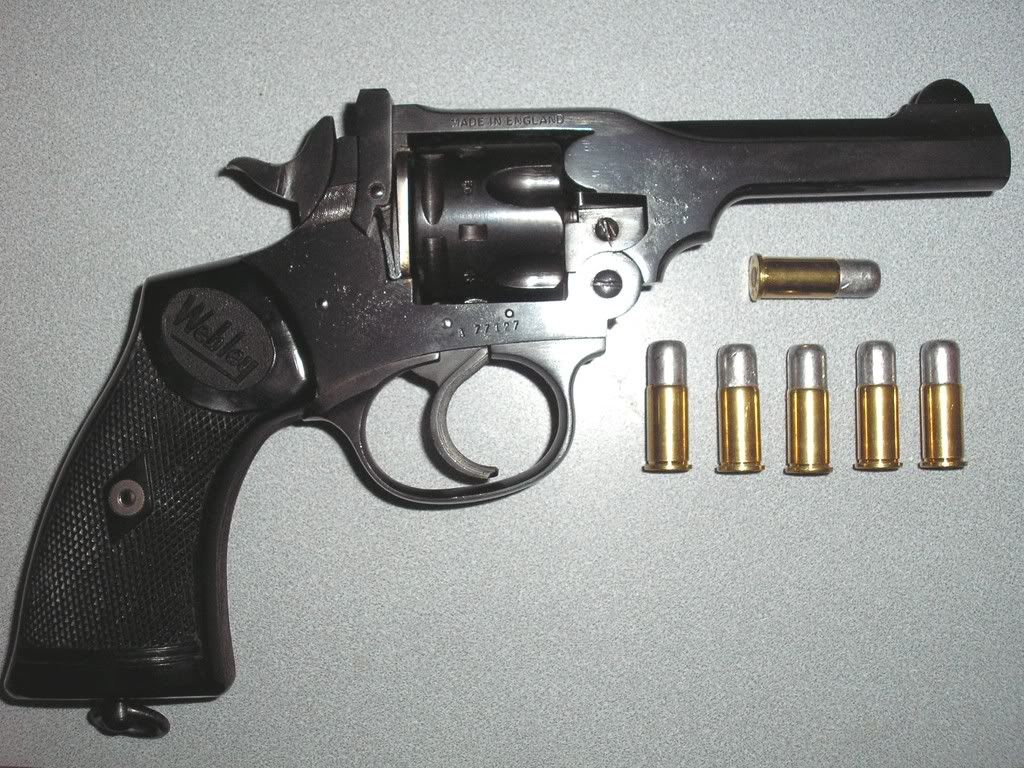 It is a Webley MK4 .38 S&W in "War Finish", it is in excellent shape, tight, fires great and has the original(?) holster. The pics seem to make the finish look weird, but in person its great. No stampings for a police force or military that I can tell.