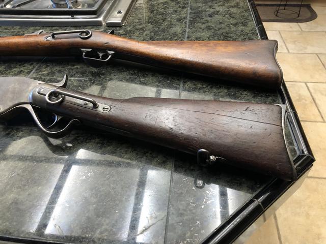 The Springfield has a “C” marked on the rear sight. The barrel is 22” and is .73 at the muzzle. There is no wood plug on the forearm. No cleaning kit in the butt. There is a “US” stamping on the butt plate top side. It is stamped model 1873. There is a saddle ring on the left side.