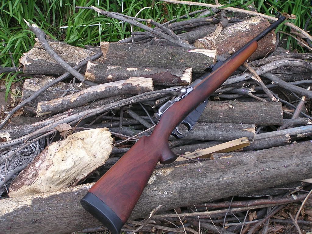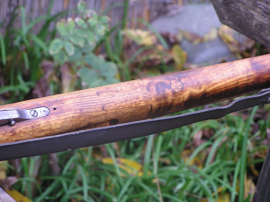 Thinking it maple, I made repairs using maple strips to the barrel channel and to the inlet at the trigger guard, and I used bamboo dowels to hold it together. Heck, it was a project for an old fart, you know? For the finish, in the Finnish manner, I first treated it with pine tar and baked it in the sun to cure it, then put on a few coats of Boiled Linseed Oil cut 50/50 with mineral spirits. I thought I'd make a light weight gun in case I ever went for pigs down in Livermore with my son. I didn't want to carry any of my nine pound m39's or anything while schlepping around after wild hogs. The barrel is fully floated, and the receiver is quite nicely tight in there. :-)