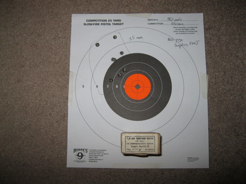 3.5 MOA. Honestly Yugo Ammo sucks but it works 50yds