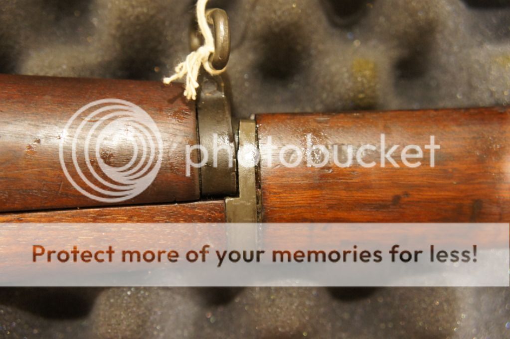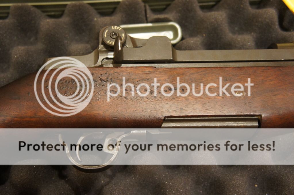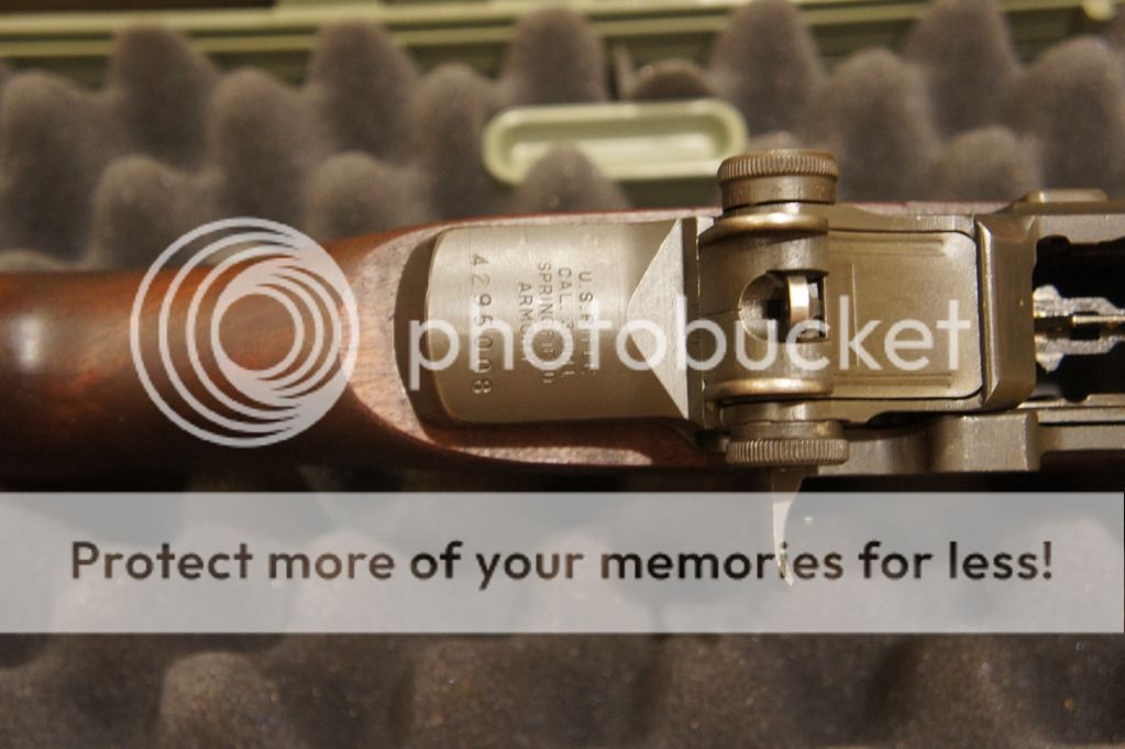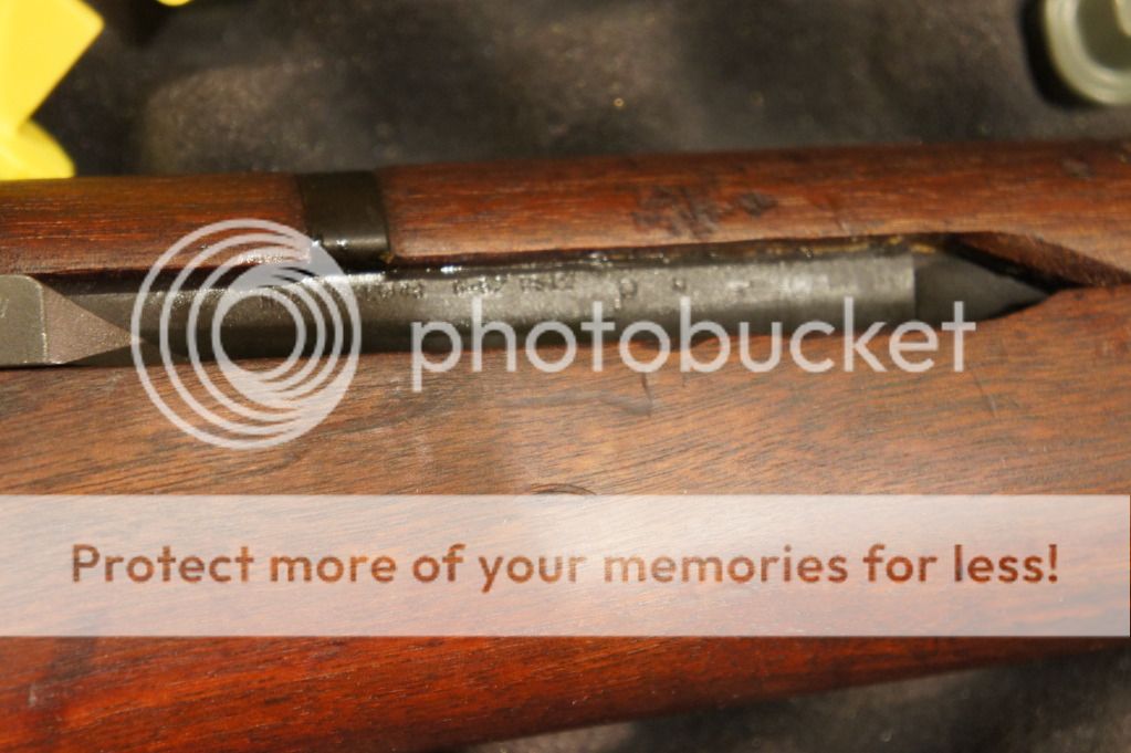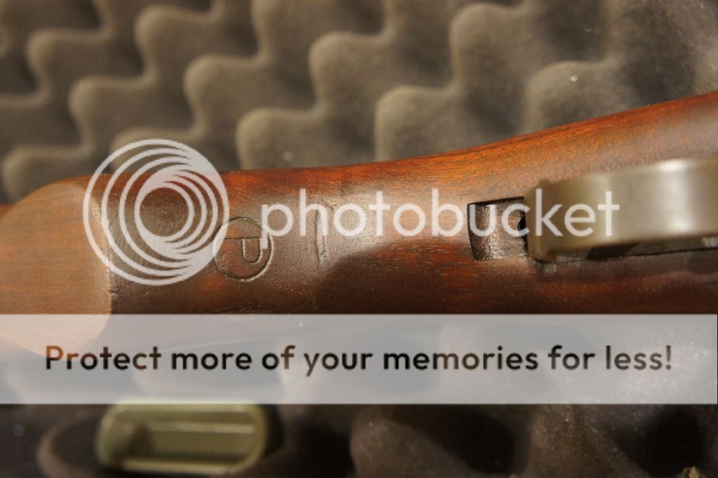 Oh yeah, the ME=1+ and the TE=2+. It has an original GI stock in very good condition. I can see the DoD cartouche and the circle P proof -mark. I can see the cosmoline caked under the front handguard. This thing needs a thorough cleaning before shooting.
