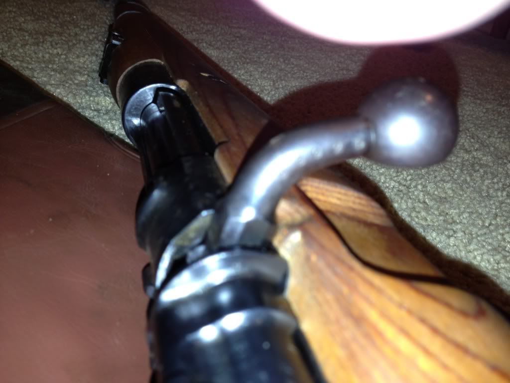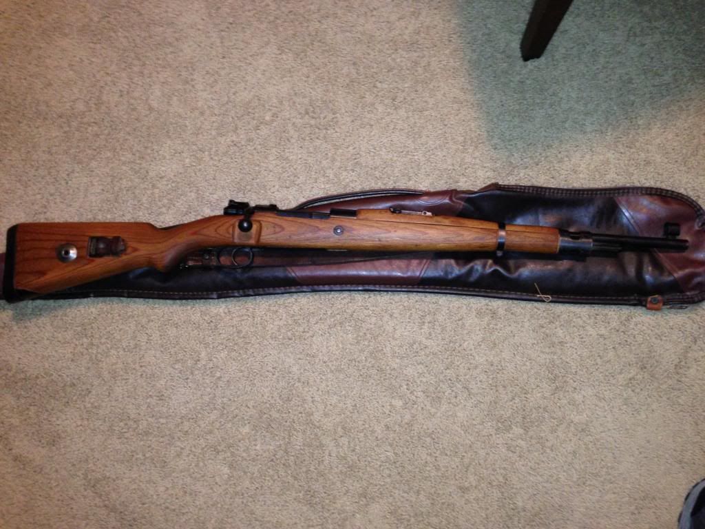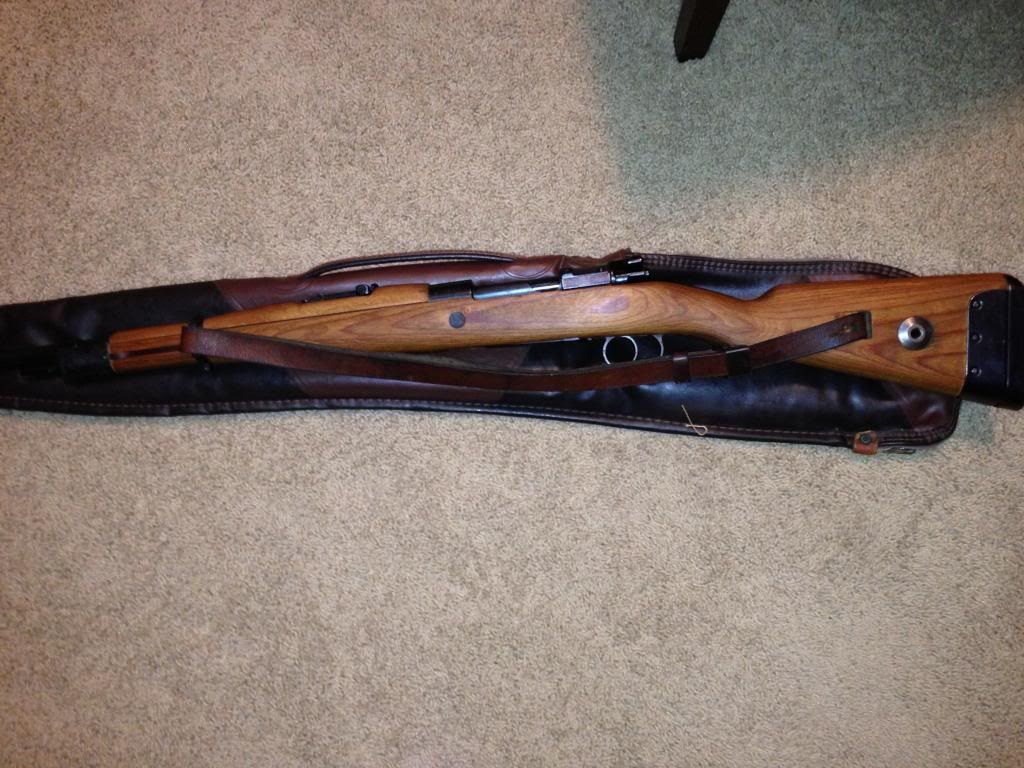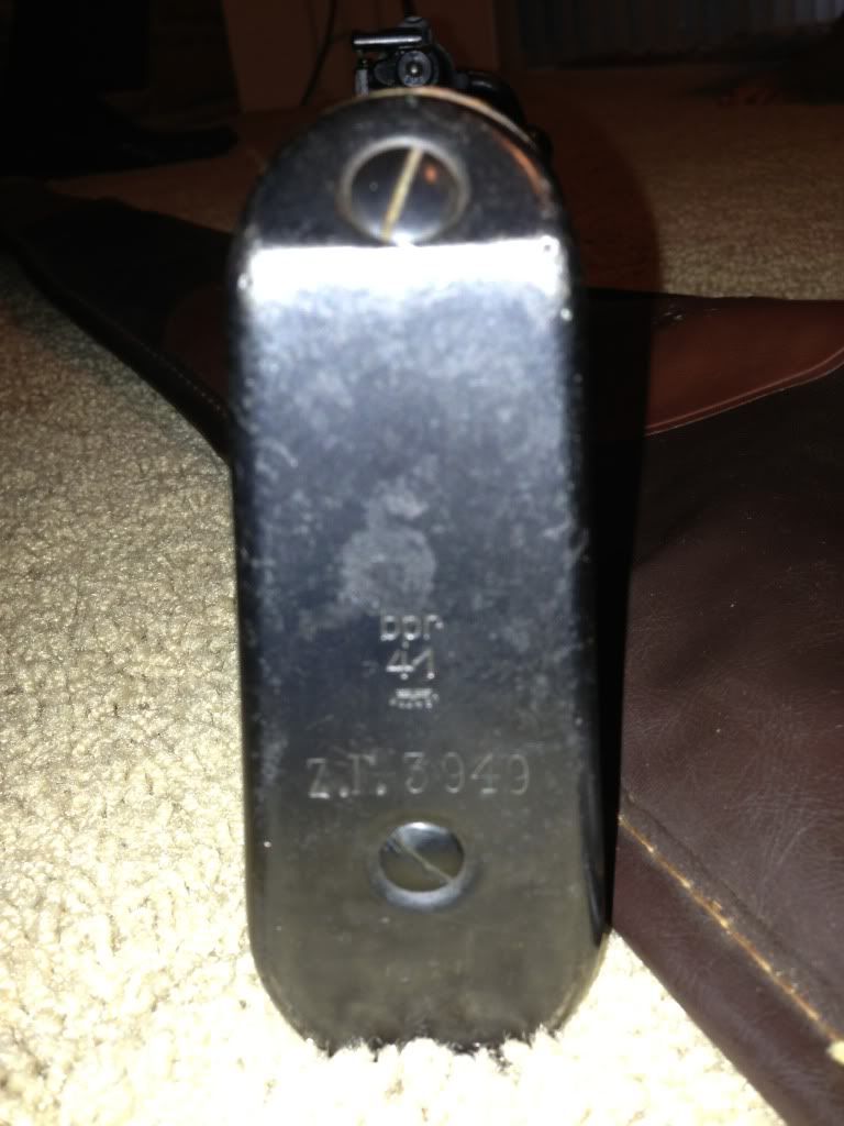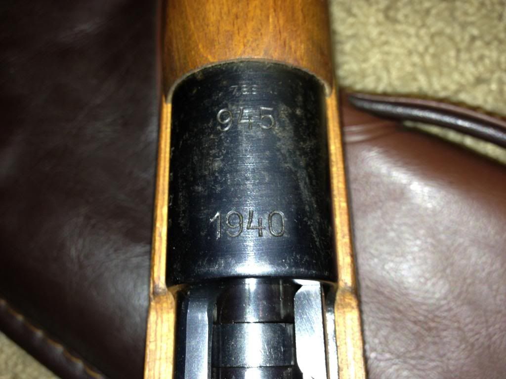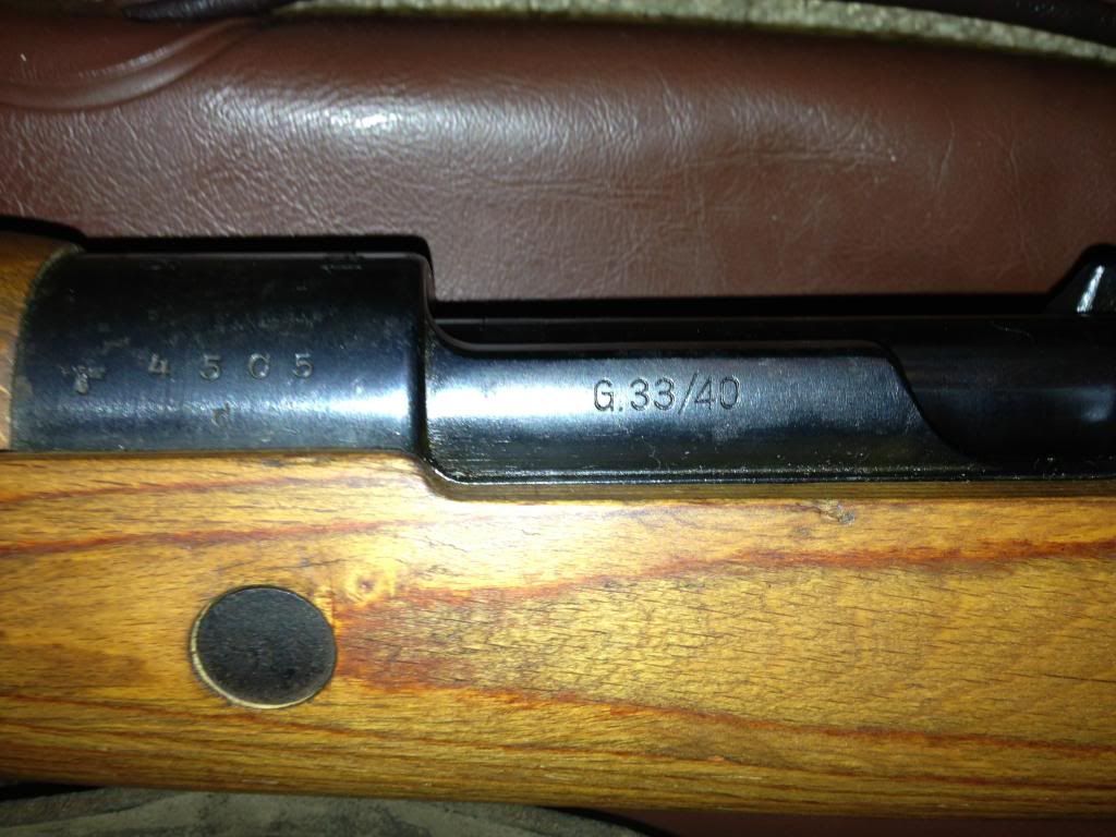 Its receiver is marked 945 1940. The receiver, bolt, stock, and floorplate all are marked with different serial numbers. On the heel of the stock is 100 and what looks like a waffenamt. No waffens are struck through. The bolt is a properly hollowed out bolt handle. I have not been able to remove the receiver from the stock to confirm the lightening cuts, however the ring of the receiver looks to be correct to a G.33/40. It does have the sight hood, however the cleaning rod is missing.