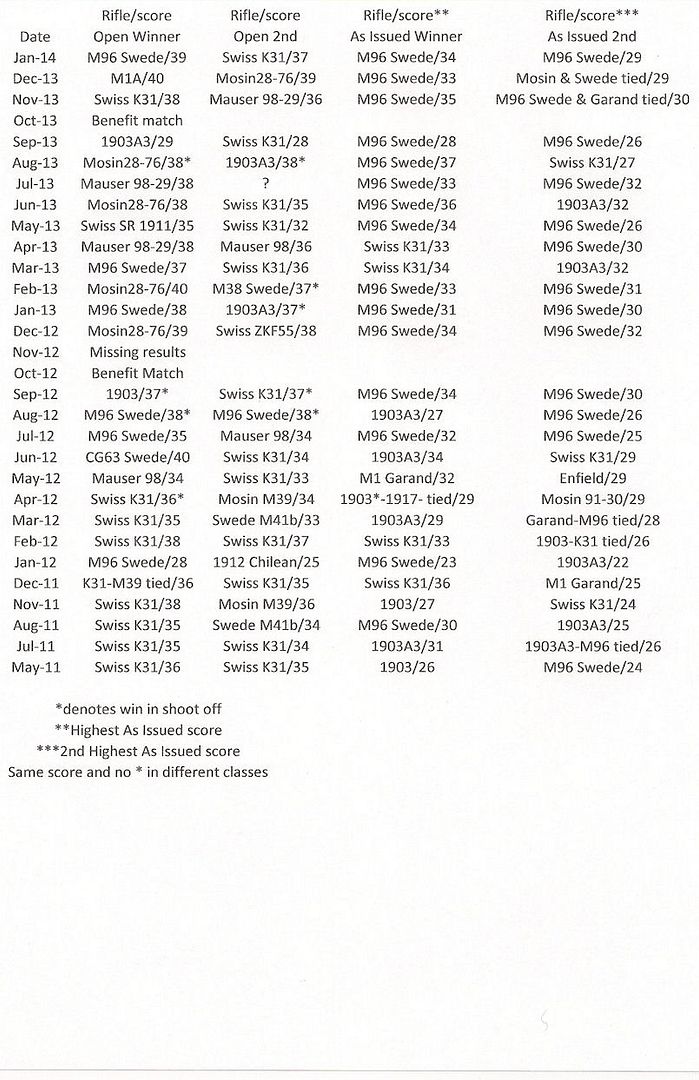 With all the talk about needing a Swede Mauser to win, I went back through the results I've saved and compiled a list of the scores for the highest score and 2nd highest score in the As Issued class and the Open class.