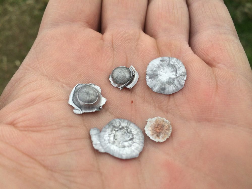 I was shooting my Romanian Tokarev and my P64 yesterday at my graduated AR500 targets and I kept seeing nice reflections of what I thought were chips of pain off of the targets from the backlit sun as I shot. I walked around near the target and found these in the grass. Guess which are from which gun.
