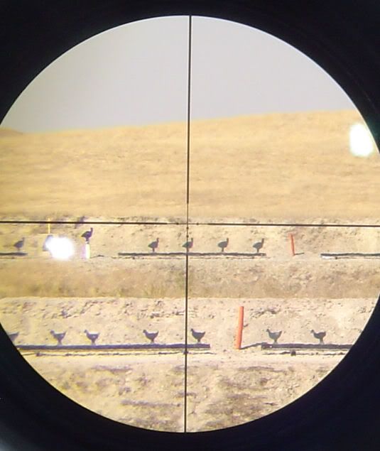 That worked out well for the silhouettes which are at 200, 300, 385 and 500 meters (220, 330, 420 and 550 yards). With a 100 yard zero that meant I could hold the 1st dot on the chickens, the second dot on the pigs and the 3rd dot on the turkeys and it was virtually dead on for elevation. For the rams I just needed to dial an additional 2 moa elevation and I could hold at the tip of the bottom vertical line.