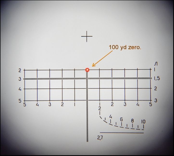 Lowered reticle and laser zeroed at 100yd. Eye relief is somewhat close but not that a big deal with mounting it a bit rearwards.