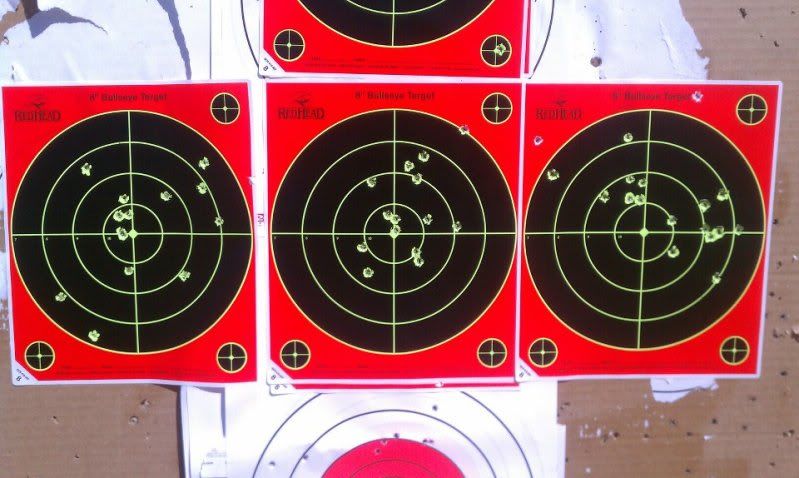 so, I shot today at the Lucerne Valley Lions Club range.... 100 yards in moderate to high crosswinds. from the bench using my bipod and no rear rest. my results are below. as indicated in the picture, these are 8" targets. I was using Remington Target .40 grain ammo. I actually had no issues with these rounds, although I've read some pretty poor reviews of them.