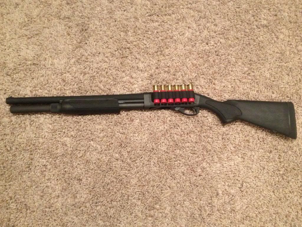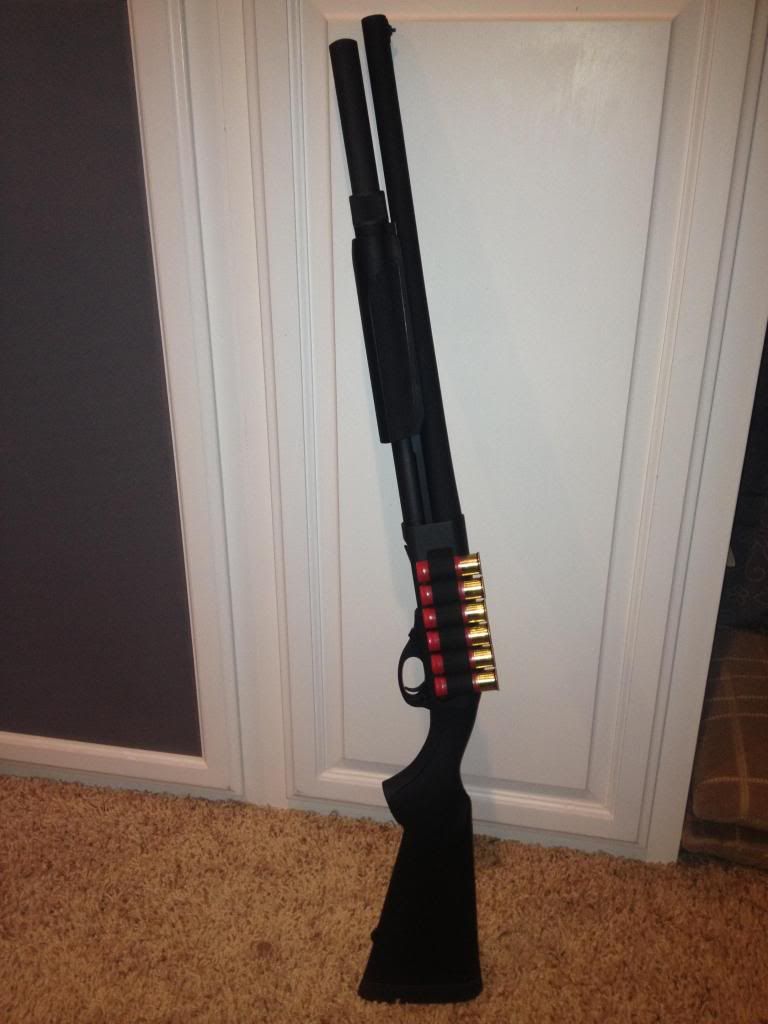 I decided a couple of weeks ago to tacticool my stock 870 Express. Added a Wilson Combat +2 extension. Had to drill the indents out then de-burr it and add some blue to it. Purchased a new 18.5" Parkerized Improved Cylinder barrel with bead sight straight from Remington with the advice of Aippi. (thank you BTW) Grabbed a Mesa Tactical 6 shot side saddle. I was going to purchase a tactical forend to allow the use of the side saddle, but then decided to cut the stock one down and round the edges. It actually turned out pretty decent. I might just keep it that way.