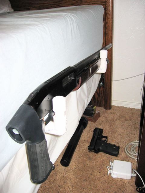 I have a stock Mossberg 500 as my HD gun and was thinking of ways to keep it stowed. I was thinking some kind of horizontal sleeve on my bedframe so it's out of the way but easily reached. Does anybody make something similar to that, or should I just get the flimsiest sleeve I can find and sew on some velcro straps or somesuch?