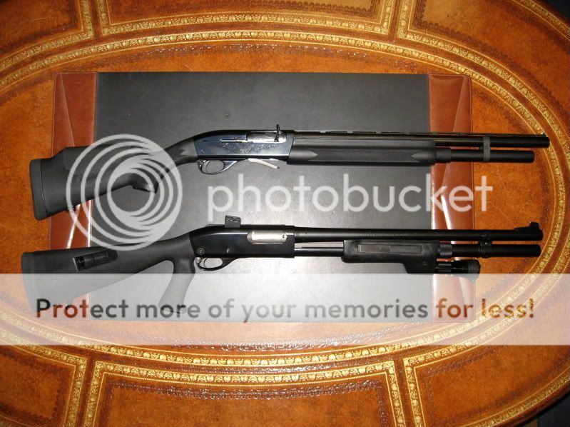 Here's a 1100 I built a few years back, the barrel is an un-cut 21" factory barrel with a full choke and vent rib I found on eBay. I installed a speed loader, tactical charging handle, trigger job with oversized safety button, magazine extension, Speed Feed stock and forend and had the internals np3 coated by Robar; it's very reliable. The 870 below it was fully customized by Robar.
