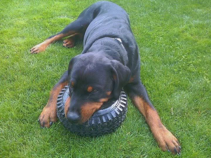 Here's my rottie Taktik about 5 months ago, chewing on his tire, and even though he speaks German, he's so American he was born on the 4th of July