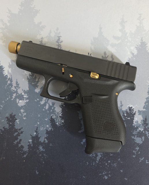 Glock 43 bought cheap at a pawn shop. Some NZD gold pins and extended controls with a PSA micro dagger threaded barrel. Even with LEO exemptions I couldn't get something like this in CA. Still need better sights and a suppressor.