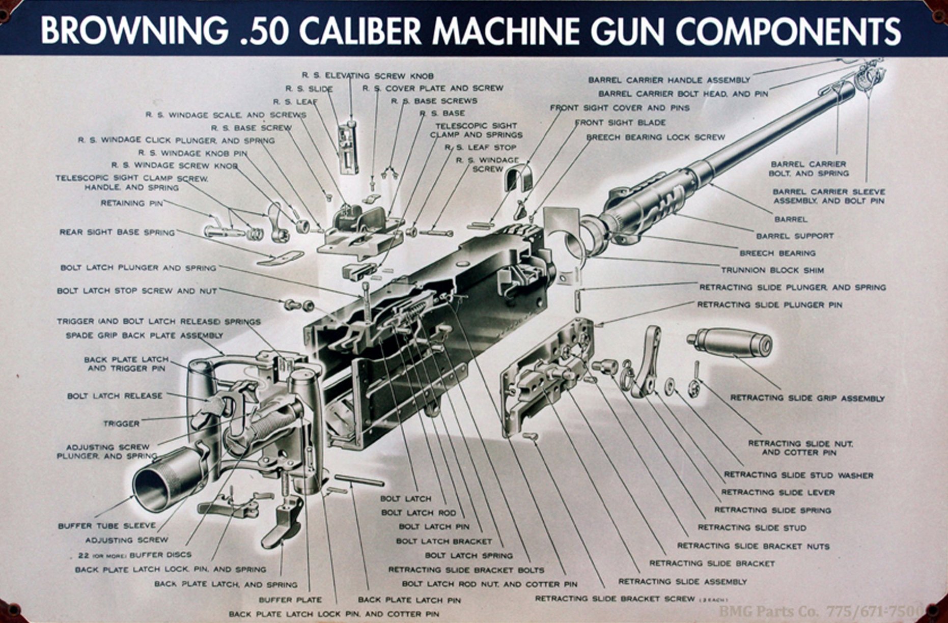 BMG Parts Co. sells an extensive inventory of Browning M2HB Ma Deuce machine gun parts, accessories, manuals, tools, gauges and gun mounts