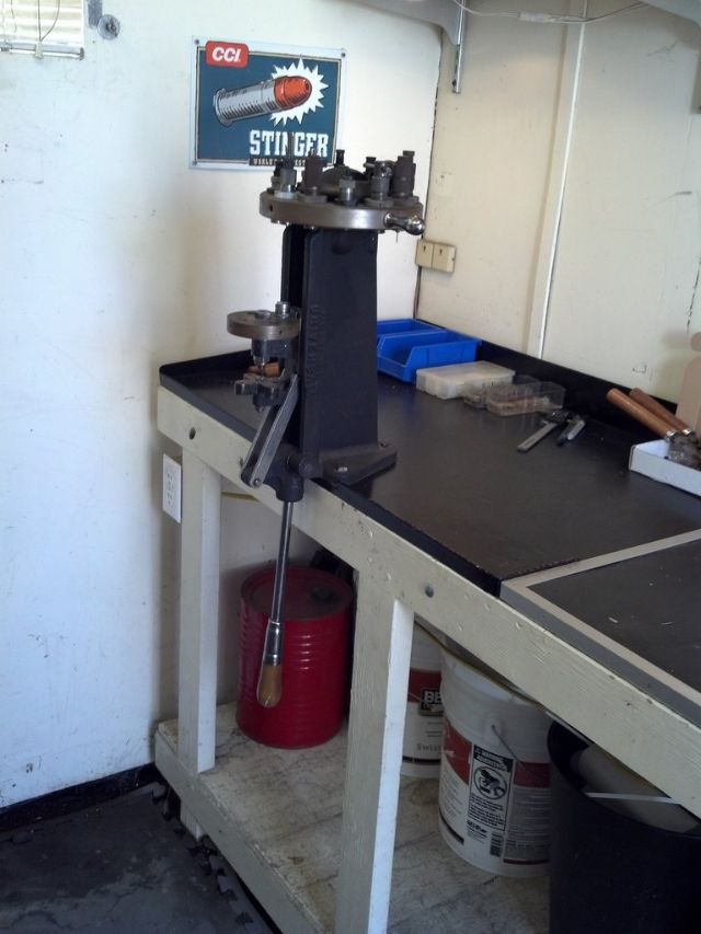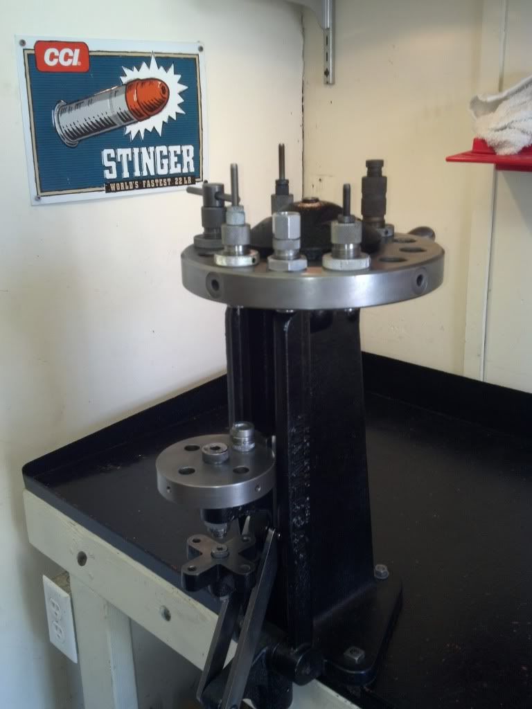 My dad's dad (my grandfather) bought the Hollywood press. It may have been new at the time. They do not go cheap. Mine has all 7/8 threaded holes. Some have a few large holes for large caliber or shotgun reloading Mine does not have the brace for swaging and I don't know if it is rated for it. It does put most single stage or turret presses to shame for size and it feels very sturdy. The top turret is around an inch thick and is probably cast iron although I thought steel was stronger for those type of applications. The body is cast iron as well. Mine is one of the bigger ones, but there is one that they made that dwarfs mine.CGT80: How much was that Hollywood again? I have been checking fleabay but one guy was asking like $600. I forgot, can you swage on that if you wanted to? Did it have some extra stabilizer that also came down on the backside to brace it for swaging as well?