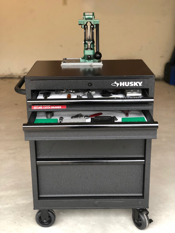 Is this an all-in-one-cabinet reloading station? Also, is there enough room to dismount and store the press inside it as well? I've been trying to figure out a compact, mobile solution for reloading - I was kinda debating on building something similar. Are you able to fit powders and all that in there too? How do you clean your brass?I found a good deal on this Husky tool cabinet. Added a wooden top for more stability cut from an old Ikea desktop. The press doesn't need a hang over so I can mount it on top while keeping the drawers accessible or needing a raiser. All reloading dies, tools and supplies are stored in this cabinet.