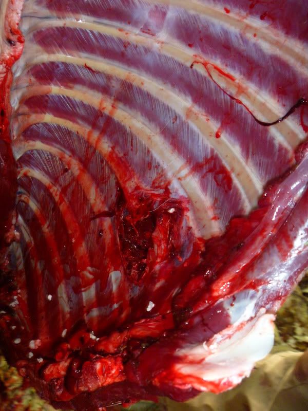 There was a defined entrance wound, but there definitely wasn't a sure exit hole. The bullet broke into pieces as soon as it entered the skin and fragmented bullet shards cut up the lungs and heart into a pulp. So I didn't even want to bother showing the results of those vital organs, it was all a bloody mess.