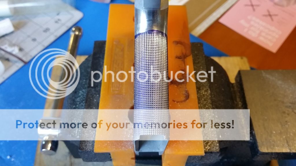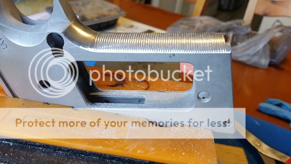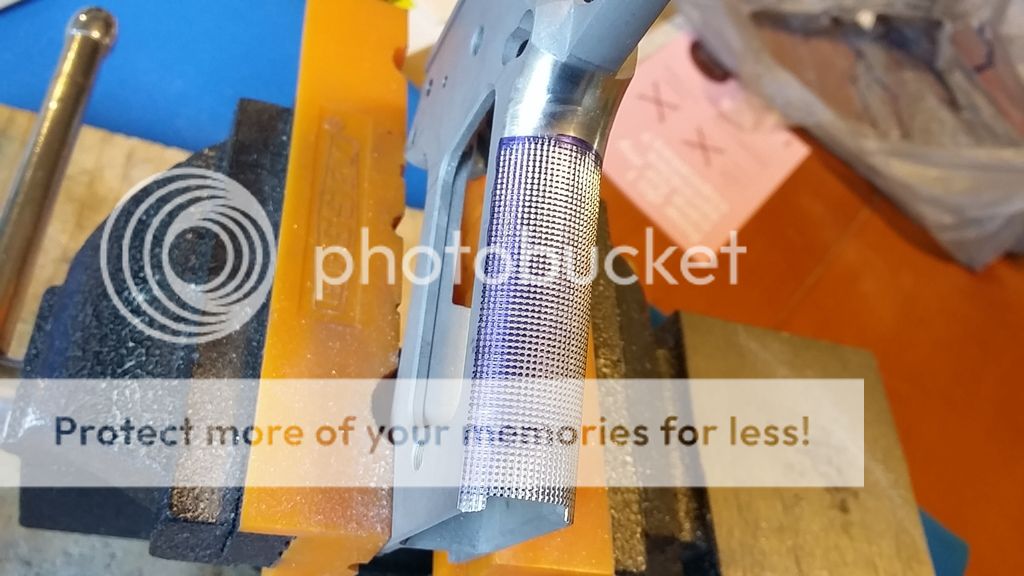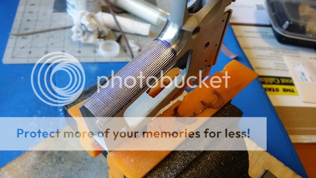 Okay, maybe "test of courage" is a bit much, but like other 1911 modifications that requires cutting into major components, front strap checkering can be a test of patience and nerves... It took a long time for me to actually work up the nerve to do this mod but decided to try it anyway. I am not finished yet but was able to finish filing all the guide lines in about two hours with little breaks in between. I will work on pointing the diamonds next week. The jig used was from Power Customs. I'm doing 25 LPI and that is a 1911builders' 7075 frame. Here are the pics: