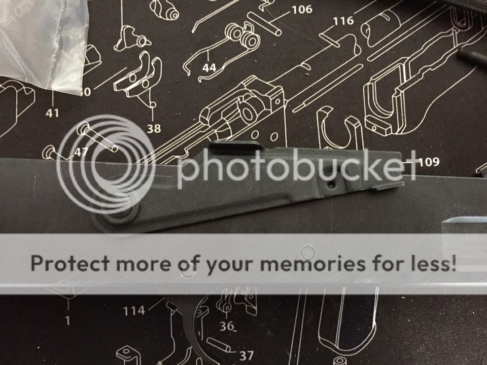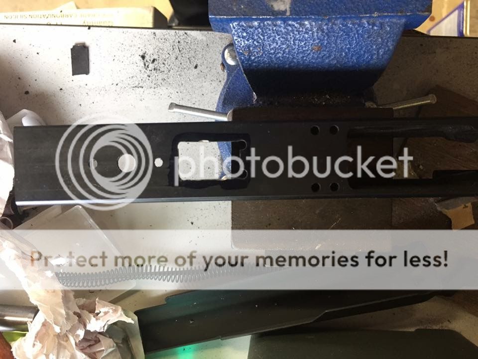 Trigger slot marked and ready for drilling/cutting. I'm using a double hook G2 trigger (3 922r parts). Used a 80 flat to mark the trigger slot outline.