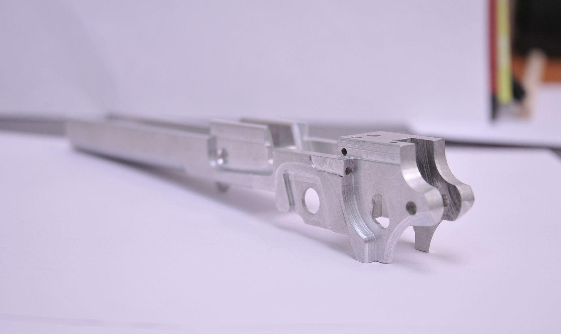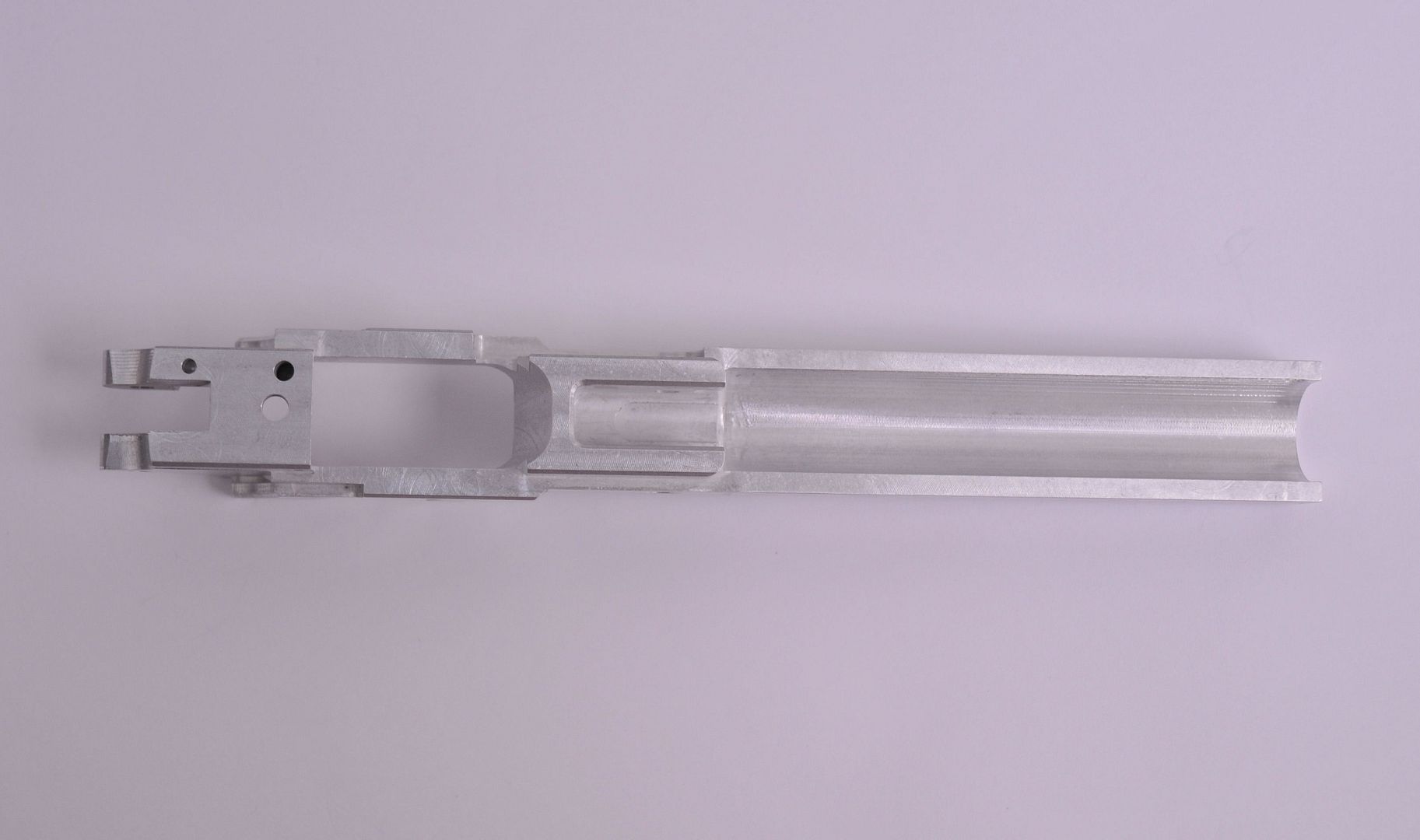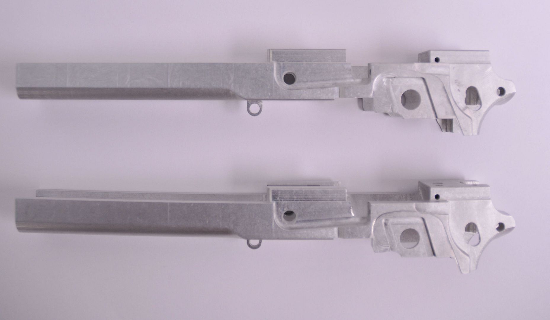 These are from a prototype run made out of 7075 Billet Aluminum. They have half the weight of the steel frames, and this is prior to cutting for barrel fitting and completion.