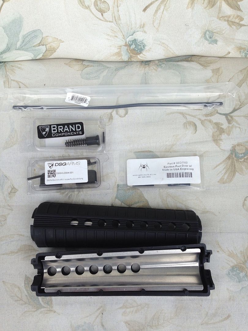 DSG arms ejection port door with hardware. Spikes laser engraved door(see label), melonite mid length has tube(Dsg) spikes mid length handguard, DSG complete forward assist. Also, A2 birdcage off my 6920 not shown here. All parts are brand new never used. Want to sell all of it complete.