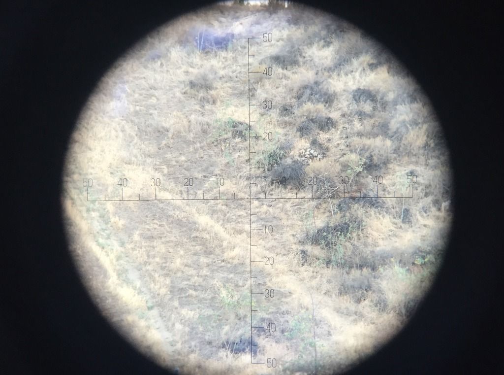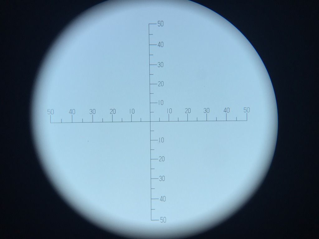 Inside the left ocular is a reticle in the shape of a cross numbered from 10 to 50 on each of the four stadia wires. There is a smaller post in between representing 5 mils increments for a total of 100 mils vertically and horizontally. A nice feature when used in conjunction with a mil scope for spotting. These are an excellent tool for learning to use a mil reticle for range-finding without freaking out the neighbors.