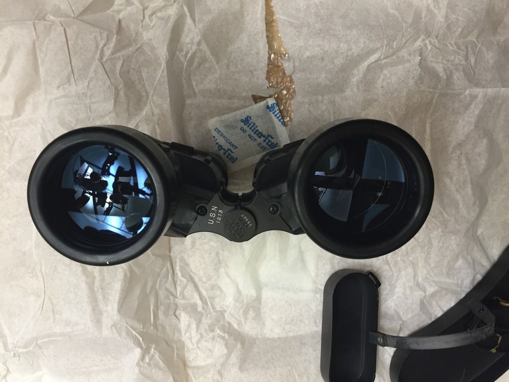 I have a few pair of surplus U.S. Navy 7x50mm binoculars. They were manufactured in 1986 and are still new in the wrap. The original shipment for these was from Kama-Tech Corp in a Chula Vista and delivered to the Navy Supply Center in San Diego. The bino's come in a box sealed in a foil lined bag. Each bag is marked with the item description. Inside of the bag the units are packed in bubble wrap, under the bubble wrap they are wrapped in a tissue paper with a desiccant pack. The units are rubber armored and marked "U.S.N". The binoculars come with a set of covers as well as a neck strap. They have a field of view of 394 feet at 1000 yards.