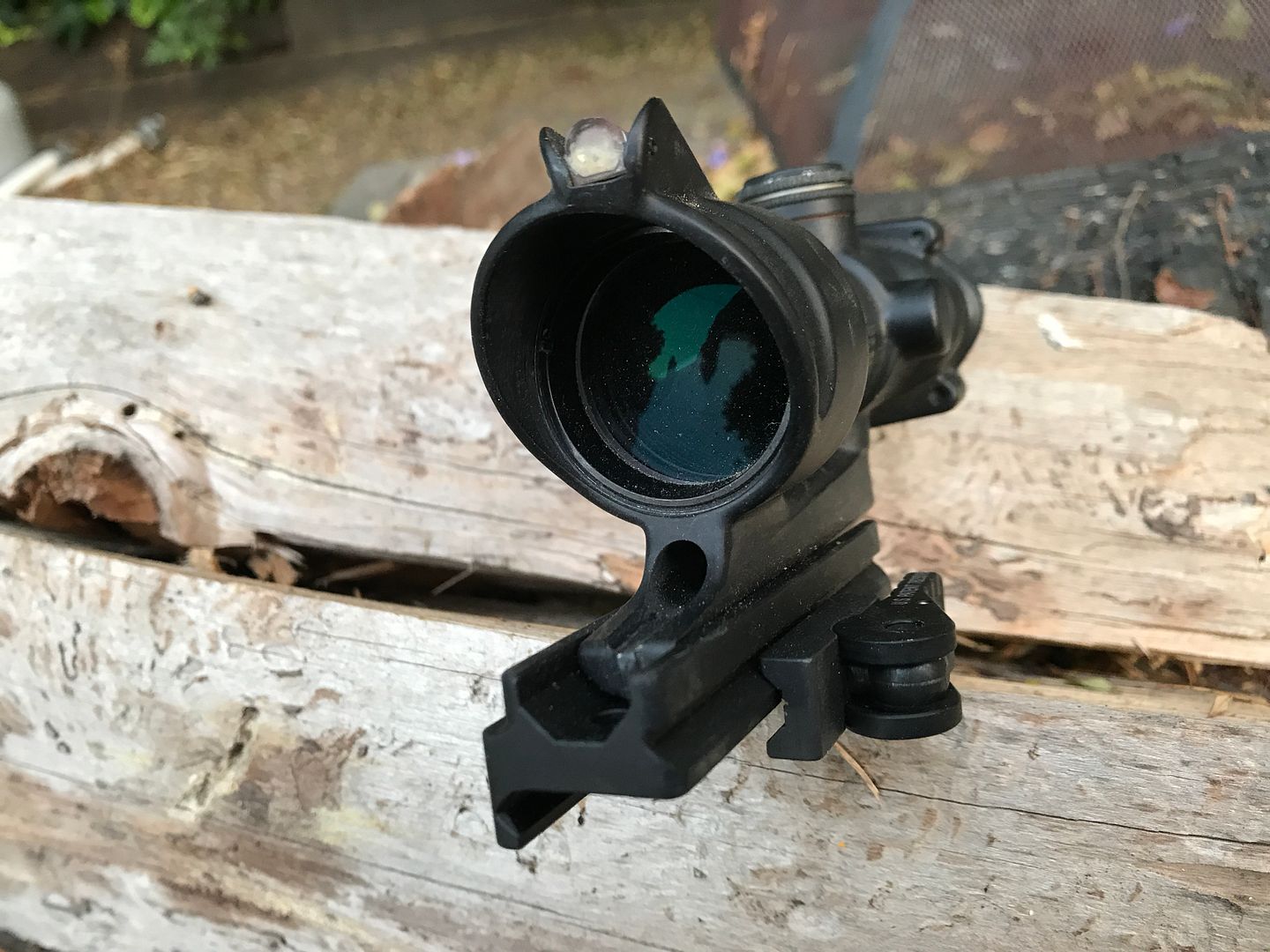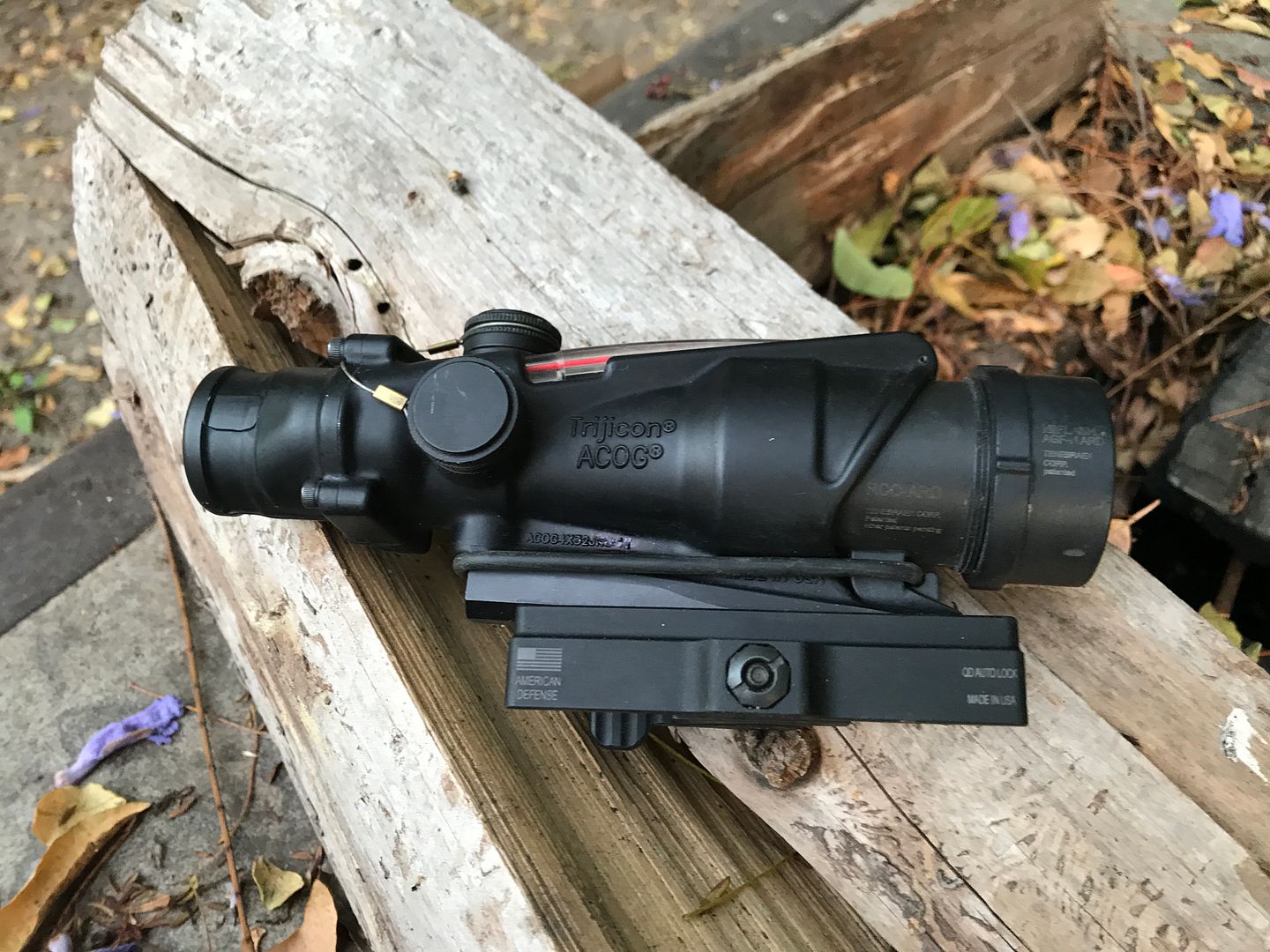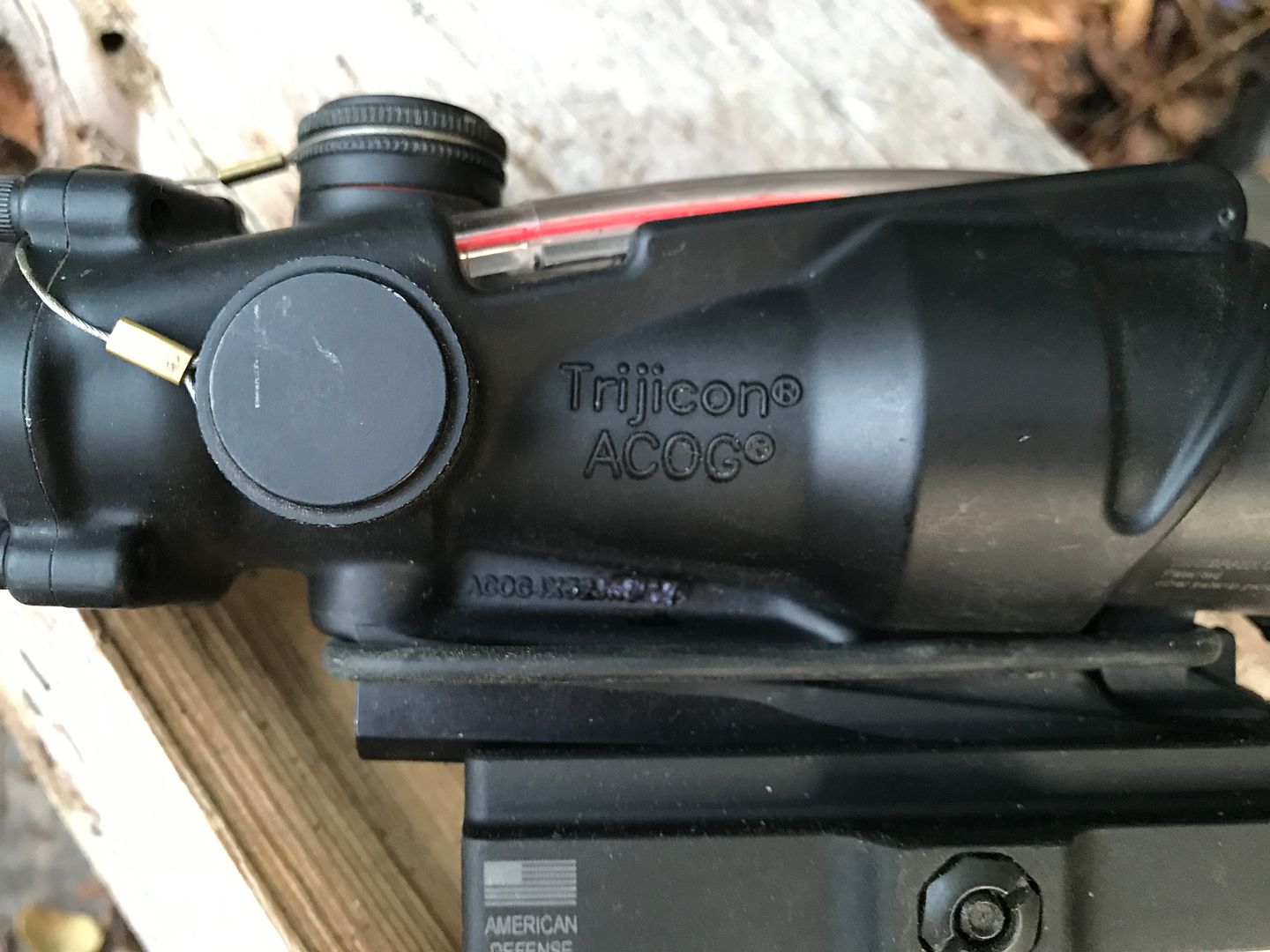 Here we have a Trijicon TA 31 4 x 32 ACOG that I bought off a fellow Calgunner a year or so ago. I bought it for a build I was planning but still haven't gotten around to it so it's just been sitting in the safe. The lamp is SUPER bright in the daytime, still visible at night but slightly dim in the dark (compared to new) That's pretty much per the norm as when I dated it, it's (as I recall) 7 years old. The glass is perfect and REALLY is nice to look through. The quality of Trijicon optics is amazing. I tried to get a pic of the reticle or showing the brightness of lamp but it's really difficult to capture with a camera phone. But you can see that it's bright and I included a pic of which reticle it has.