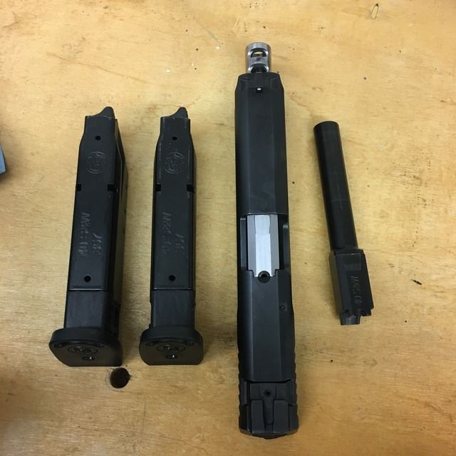 For sale is a complete S&W M&P upper in .40 S&W. Upper comes with barrel, sights, recoil spring/rod, etc. Ready to slide onto an M&P lower and ready to fire. Upper has had 4,000 rounds through it, however will come with a ported stormlake 9mm conversion barrel and a NEW factory M&P .40 barrel. New .40 barrel has had a few hundred rounds through it. I can include the old .40 barrel upon request (old barrel has a knick in the rifling). Also will come with 2 10 round .40 S&W magazines. Slide is in perfect condition, no knicks or holster wear. Everything pictured is included. $325 OBO.