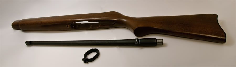 Ruger 10/22 Wood Stock and blued Barrel with Barrel Band (Plastic).