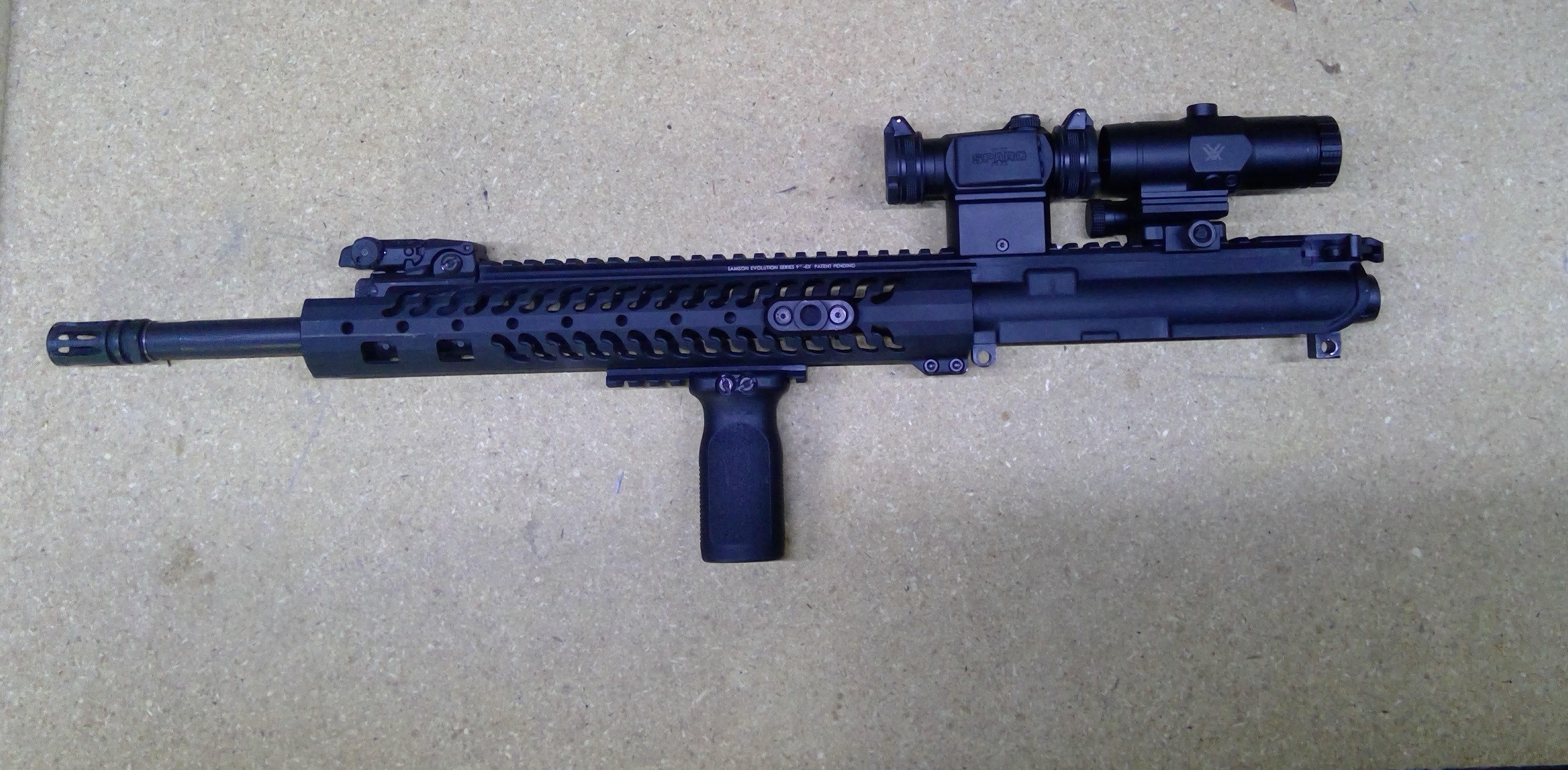 Adam Arms 18" piston driven with removable ALG defense flash hider, magpie front grip, Samson float with rails on all sides, less than 40rds through it, no optics or flip up BUIS