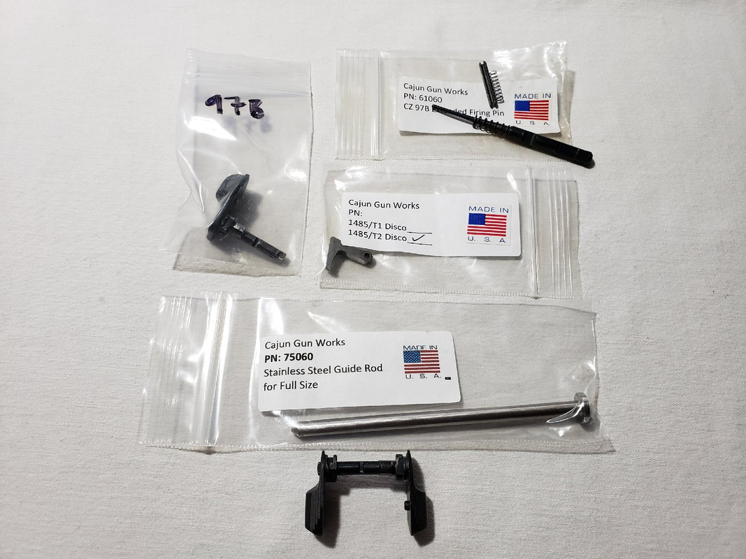 CZ 75 SP01 Ambi Safety. $40 shipped. CZ Full Size Gen1 Steel Rod - Sold. CZ 97B Extended Firing Pin $20 shipped. CZ 97B Safety. $25 shipped. CGW T2 Disconnector $33 shipped.