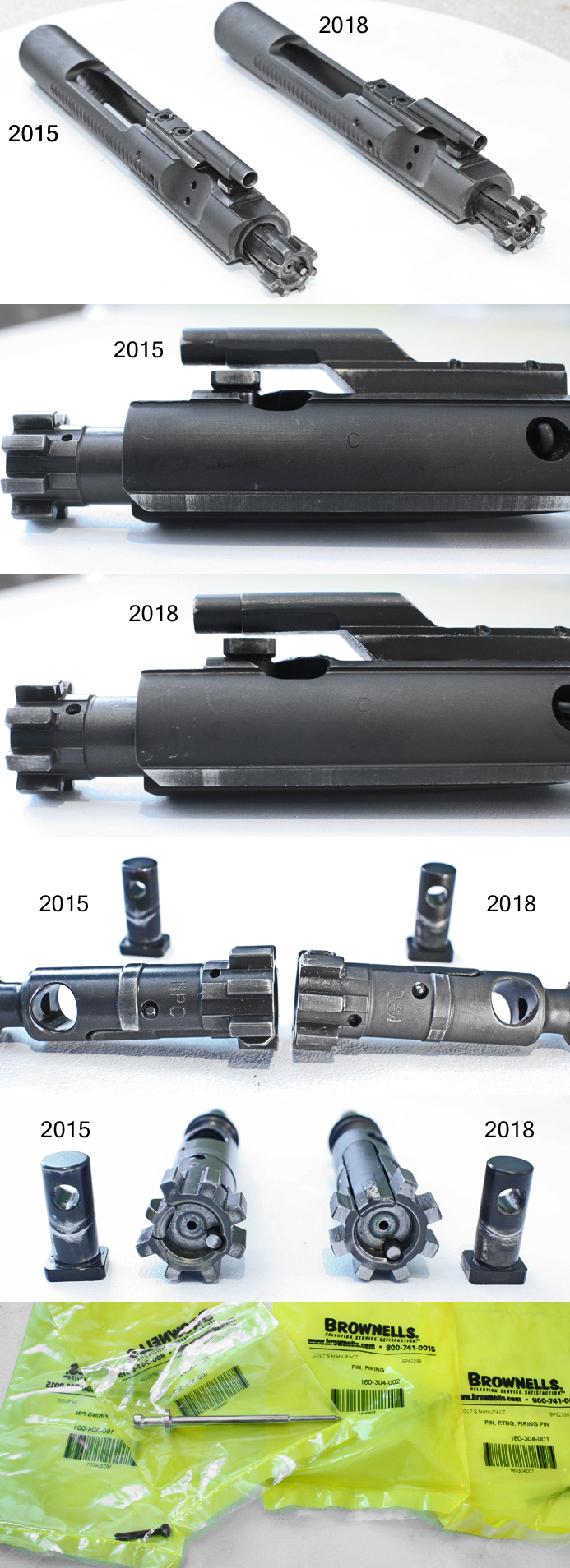 The 2015 is priced higher because it was manufactured at a time when you know you were getting a 100% Colt product. The 2018 is still a genuine Colt but you can see the difference with the clean "C" stamping on the 2015 compared with the 2018 BCG which is more of an etched marking. Same with the "MPC" markings on the bolts respectively. Included are brand new Colt firing pins and retaining pins. Purchased from Brownells.