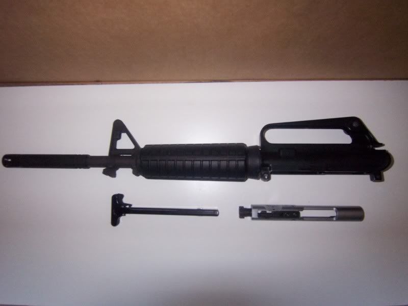 1. Olympic Arms complete upper reciever w/fixed carry handle. Chrome BCG. Standard charging handle. 1:9 twist. 11.5 inch barrel with a PERMANENTLY ATTACHED flash suppressor. Unknown brand of BCG $400.00/reasonable offer