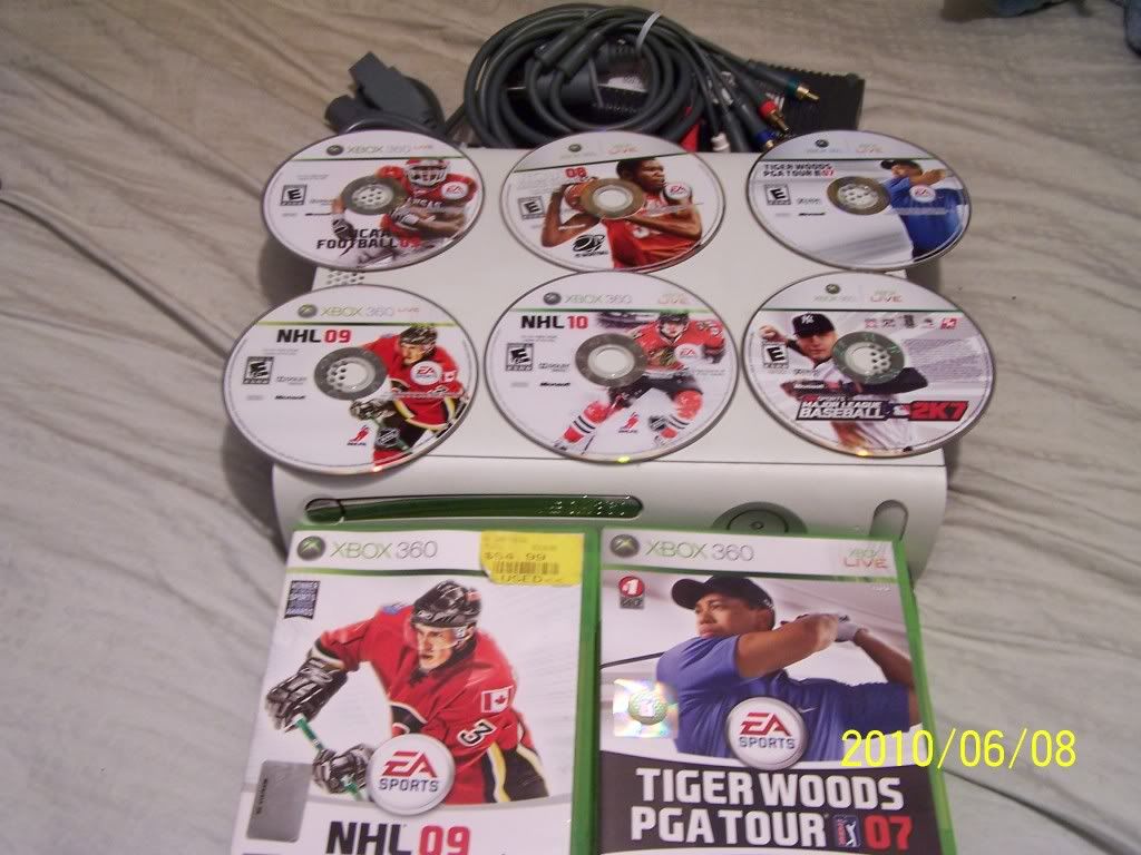 12. Xbox 360 with all cords, works fine, comes with NHL 09, NHL 10, NCAA 09, MLB 07, Tiger W. 07, Ncaa basket bal 08. All work fine. package is only $170!!!!OBO..