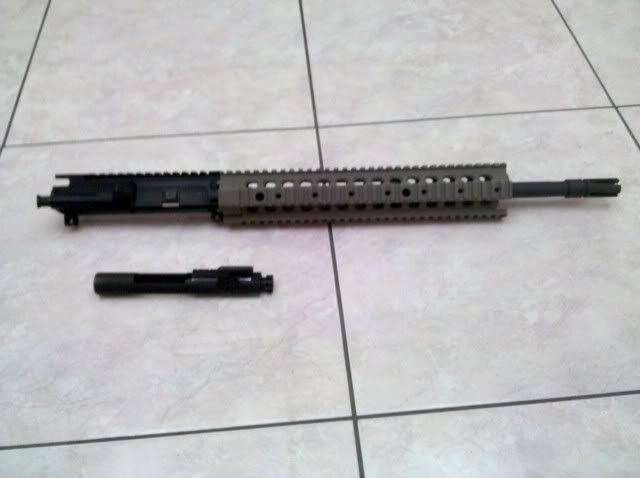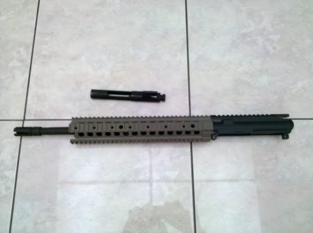 I purchased this upper new, it started its life as a GG&G Dominator Upper (upper rec/barrel made by LMT). I added a Troy low profile gas block ($35), Troy 12" MRF-R ($200). This also includes a Rock River Arms bolt carrier group (I purchased new from RRA), and a brand new BCM charging handle (not pictured). The rail was initially flat dark earth (got the box still), but it didn't match to well with my magpul stuff. So I had it professionally duracoated in FDE (another $30-40). Smith vortex is not included, it will include an A2 flash hider. Asking $550 for everything SOLD